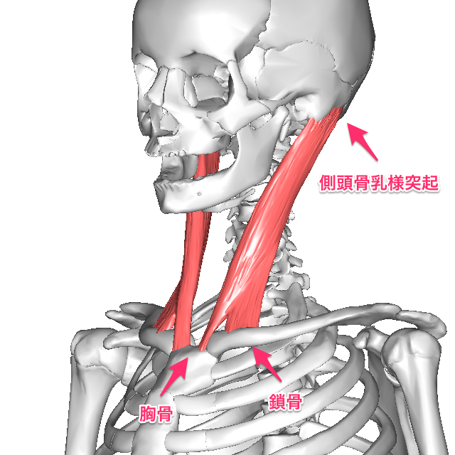 耳の後ろ側の頭の骨から鎖骨に繋がっている筋肉です。
