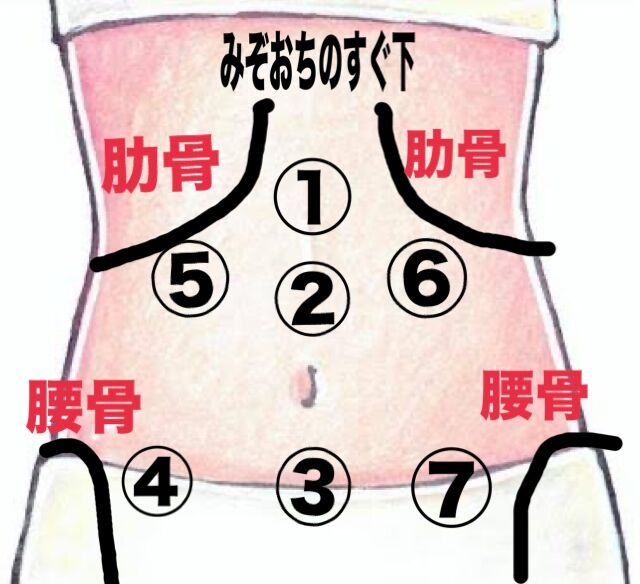 両手の指先で軽くお腹抑えるようにして3回ゆっくり深呼吸をしていきます。